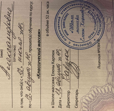 Высшее образование семейный Психолог-сексолог с 2019г.Школа массажа с 2018г практикую.